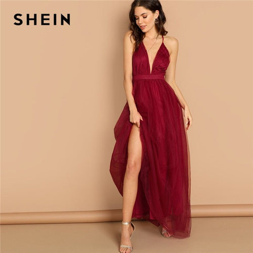 Burgundy Plunging Neck Crisscross Back Cami Dress Maxi Plain Sexy Night Out Dress Autumn Modern Lady Women Party Dresses